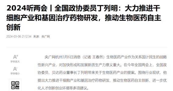Stem cells are a type of cells with the potential for multi-directional differentiation, self-renewal, and secretion of various cytokines to participate in the repair of damaged tissues and organs. With the advancement of scientific research, stem cells have been widely used in disease treatment research in China and have achieved exciting results. It is worth noting that in recent years, stem cells have been mentioned multiple times in the National People's Congress and various public platforms. Today, this article will take a look at the public attitude of the country towards the development of stem cells and their industrialization. Voice of the Two Sessions: Vigorously Promoting Gene Therapy Research and Development and Stem Cell Industry On the morning of March 5, 2024, the Second Session of the 14th National People's Congress opened at the Great Hall of the People. This year marks the 75th anniversary of the founding of the People's Republic of China and is a crucial year for achieving the goals and tasks of the 14th Five Year Plan. The National People's Congress and the Chinese People's Political Consultative Conference held in this important year have attracted attention from all parties. Life Sciences, Cell Industry, Stem Cell Technology, Changshou Technology These keywords were mentioned and suggested by National People's Congress deputies and members of the Chinese People's Political Consultative Conference. Especially stem cells have become an important topic for the 2024 Two Sessions. With the rapid development of medical technology, stem cell and gene therapy have become one of the most promising and revolutionary treatment methods in the modern medical field. Ding Lieming, a member of the National Committee of the Chinese People's Political Consultative Conference, proposed a proposal to vigorously promote the development of stem cell production and gene therapy drugs, aiming to promote China's research and development progress in this field and enhance its competitiveness in the global biopharmaceutical field. The proposal mainly includes the following suggestions: 1. Strengthening the supply of industrial policies: The government should introduce more favorable policies, encourage enterprises and research institutions to invest in the research and development of stem cell and gene therapy drugs, provide financial support, tax reduction and other preferential measures. 2. Guiding domestic capital investment: By establishing special funds and guiding social capital, more funds are attracted to invest in the research and development of stem cell and gene therapy drugs, forming a diversified and sustainable funding mechanism. 3. Adhere to science without borders and deepen international cooperation: On the premise of complying with international rules and human genetic resource management requirements, strengthen cooperation with foreign scientific research institutions and enterprises, and jointly promote the research and application of stem cells and gene therapy drugs. 4. Relaxing restrictions on foreign investment: allowing foreign investment in the field of CGT (Cell and Gene Therapy) in China, promoting synchronous competitive development of domestic and foreign enterprises, and accelerating the deep integration of industrial chains, supply chains, funding chains, and talent chains。 This is not the first appearance of life sciences in 2024. As early as the beginning of the year, stem cells, as an important research direction in life sciences, have appeared on the stage of the two sessions several times. Science and Technology Daily article: Stem cell research may trigger a medical technology revolution Recently, the Science and Technology Daily published an article about stem cells. At a scientific conference, many scientists expressed their views on the "new star" stem cell technology in regenerative medicine and unanimously believed that stem cells would trigger a new round of medical technology revolution. At present, regenerative medicine is mainly based on stem cell research and application, with the goal of repairing and reconstructing tissues and organs. It comprehensively utilizes the principles and methods of life science, materials science, computer science, and engineering to research and develop tissue and organ repair and transformation technologies and medical methods at different levels such as genes, cells, tissues, and organs. Entering the 21st century, technological development is advancing rapidly. With the continuous breakthroughs in disruptive biotechnology such as gene editing and synthetic biology, stem cell research is constantly intertwined with new technologies such as artificial intelligence, revolutionizing the research paradigm of regenerative medicine and bringing about industrial transformation in the field of life and health. The Science and Education Department of the National Health Commission has solicited proposals for the establishment of a key special project on "stem cell research and organ repair" On February 2, 2024, the Science and Education Department of the National Health Commission issued a notice on soliciting proposals for six key special projects, including research on the prevention and control of common and frequent diseases, in order to do a good job in the establishment of national key research and development plans and fully leverage the advantages of relevant units and experts in the field in condensing the needs of special projects. At present, regenerative medicine is mainly based on stem cell research and application, with the goal of repairing and reconstructing tissues and organs. It comprehensively utilizes the principles and methods of life science, materials science, computer science, and engineering to research and develop tissue and organ repair and transformation technologies and medical methods at different levels such as genes, cells, tissues, and organs. Entering the 21st century, technological deve